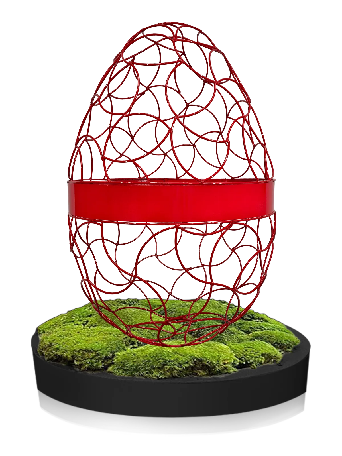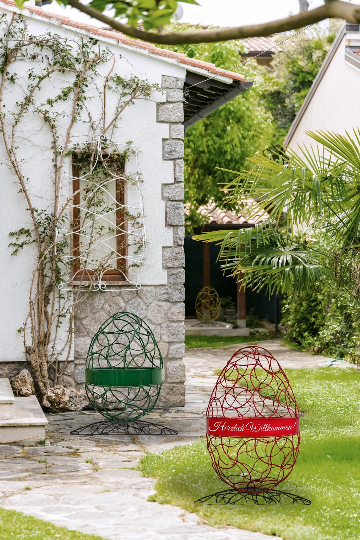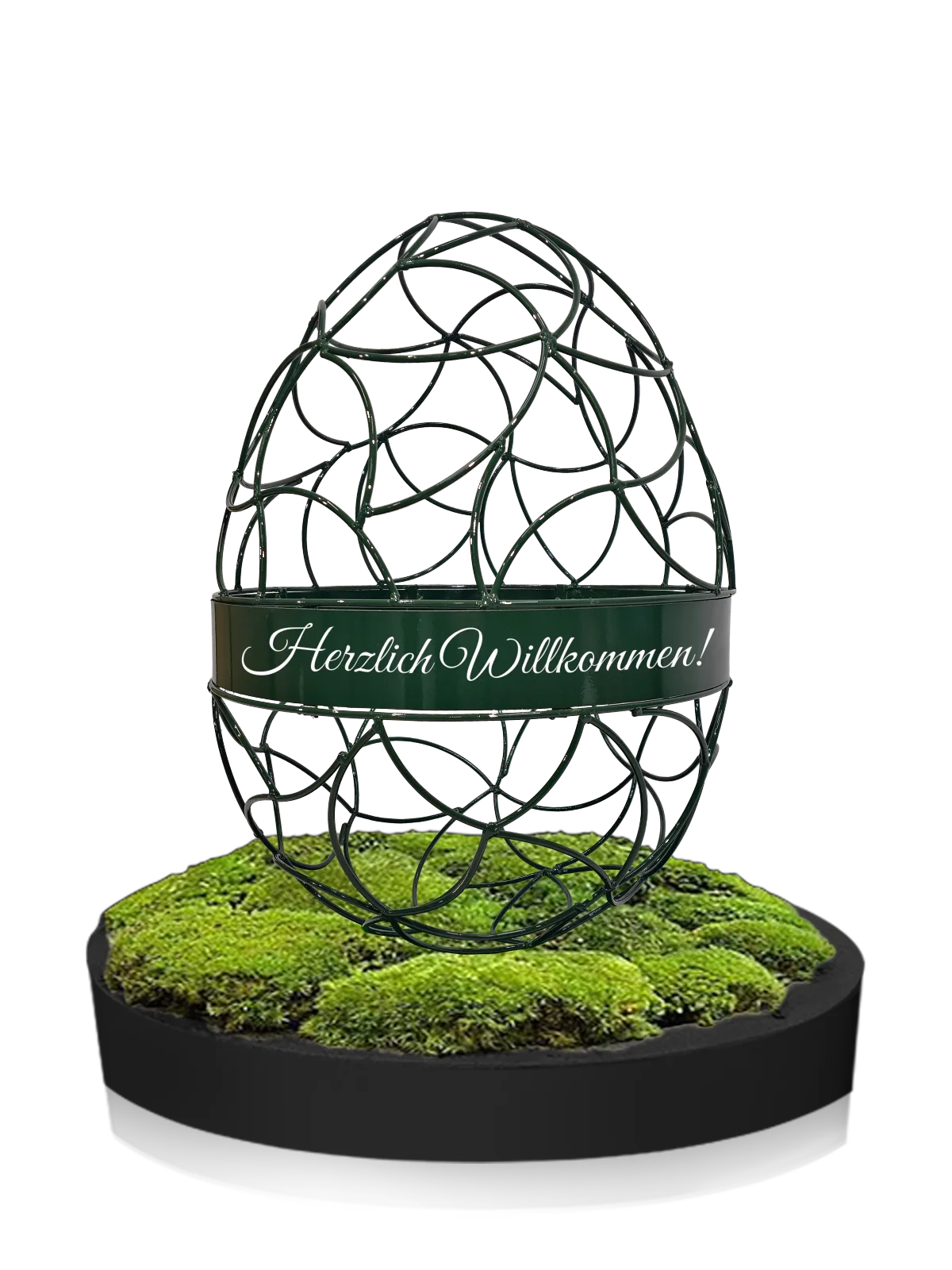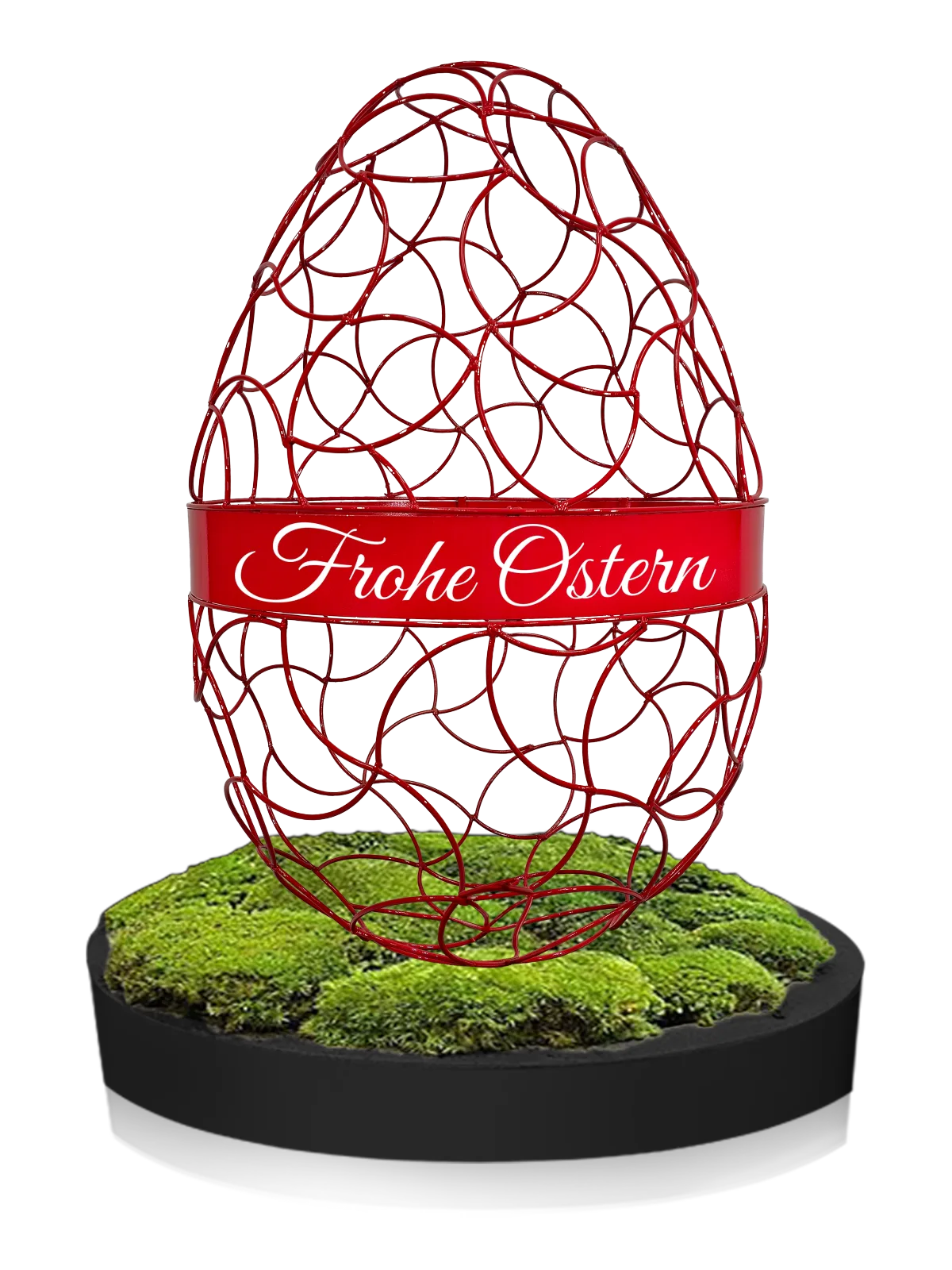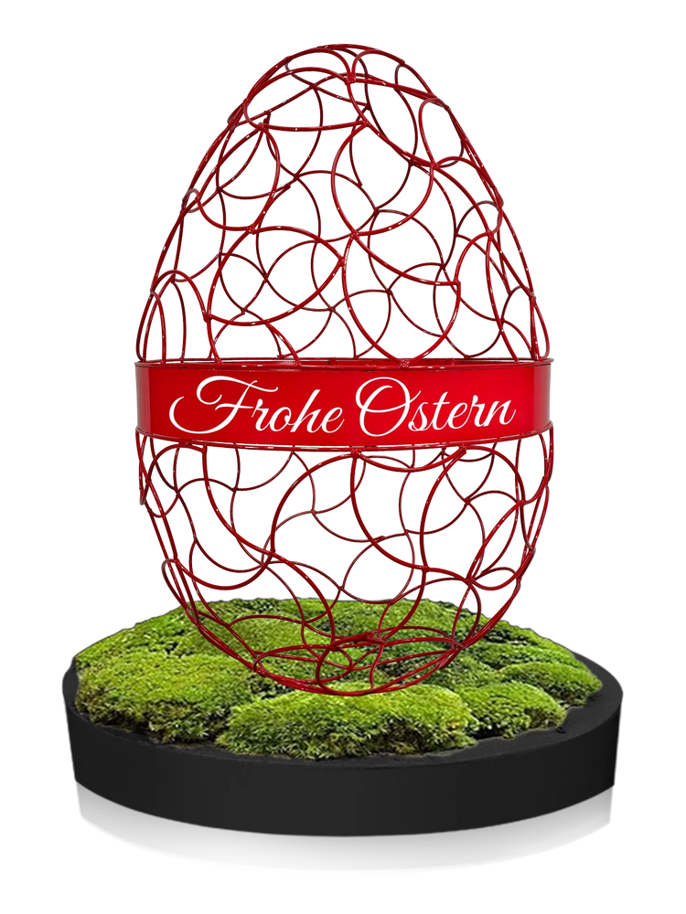 Das umlaufende Band mit dem Schriftzug „Frohe Ostern“ macht aus der Skulptur ein bewusst gesetztes Signal – sichtbar, freundlich, eindeutig.