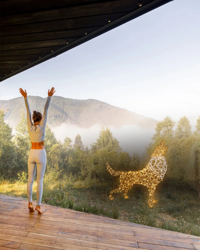 His silhouette is poised, his light dual-colored: gold for calm, white for power.